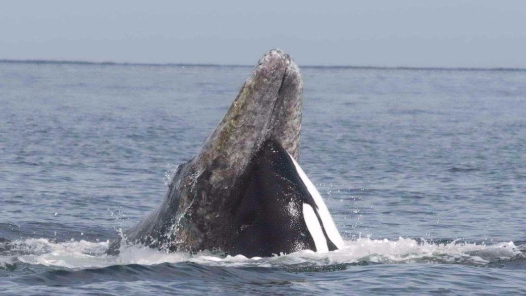 Les nageoires pectorales ont commencé à claquer de gauche et de droite lorsque les baleines se sont mises à tournoyer pour éloigner une orque intrépide qui s’est rapidement retrouvée coincée entre 2 léviathans vraiment énervés. La mère du jeune épaulard l’a finalement rejoint et la lutte a cessé lorsqu’ils se sont éloignés des baleines grises.