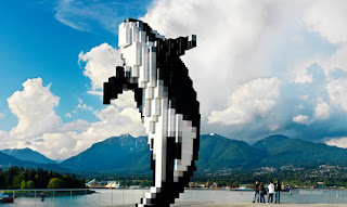L’ « orque digitale » de Doug Coupland rappelle les pixels d’une image numérique ou encore un assemblage géant de légos !