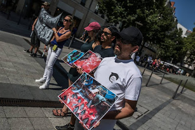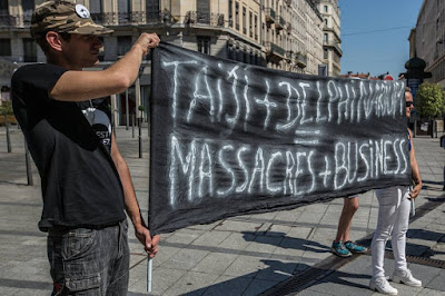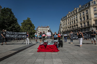 C’est sous un soleil de plomb que, pendant 4 heures, 14 militants se sont tenus immobiles sur la place de la République à Lyon ce samedi pour dénoncer les massacres dans la baie de la honte.