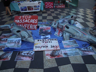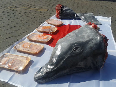 Petite mise en scène afin de montrer ce qui se passe à Taiji, et dans d’autres villes du Japon. Un dauphin découpé, les (faux!) steaks de viande de dauphin que l’on trouve sur les étals de certains marchés, et bien sûr, le drapeau du Japon. Un grand merci à Philippe et Dédée, à qui l’on doit cette réalisation aussi percutante que réaliste.