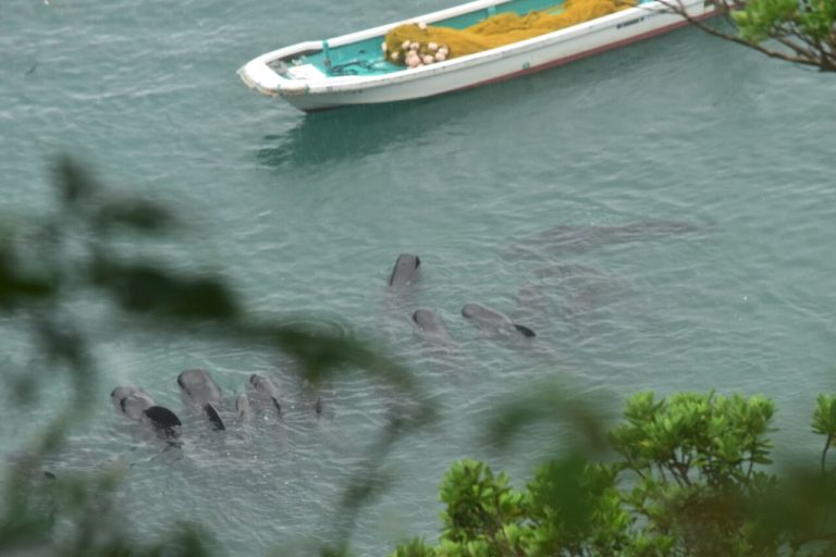 Non contents de leur première prise, les pêcheurs japonais ont également rabattu un pod de 15 à 20 globicéphales dans la baie environ deux heures après les tursiops.