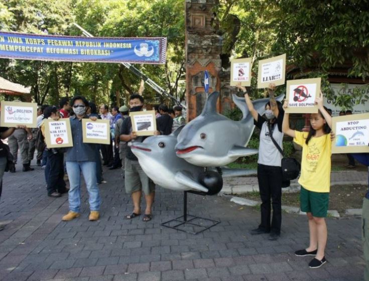 Des militants locaux protestent contre le cruel cirque des dauphins voyageurs en Indonésie