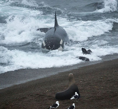 Les orques se jettent, au péril de leur vie, sur les plages pour attraper leur proie, manchots, jeunes otaries qui sont sur la plage.