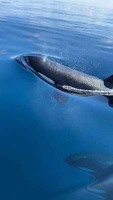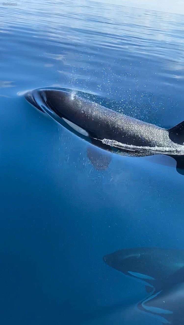 Alors qu’ils pensent d’abord à des dauphins ou des globicéphales, ils se rendent compte qu’il s’agit de la peau noire et blanche d’orques. « Il y a d’abord un gros mâle qui est passé sous le bateau et qui en faisait la même taille avec un aileron de la taille d’un homme !