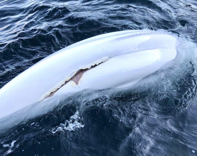 Ils ont immédiatement remarqué l’inscription sur le harnais : « Équipement de Saint-Pétersbourg ». Il y a eu de nombreuses spéculations au sujet de Hvaldimir. Il pourrait être un béluga « espion russe », dressé, et qui aurait réussi à échapper à ses ravisseurs humains. Tout comme les États-Unis, la Russie dresse des bélugas, des dauphins et d’autres mammifères marins à effectuer diverses tâches, telles que la récupération d’objets au fond de l’océan, la détection de mines, la recherche de plongeurs ennemis et la garde des navires et des bases navales. Très probablement, Hvaldimir est l’un de ces innombrables mammifères marins qui ont été exploités à des fins militaires.