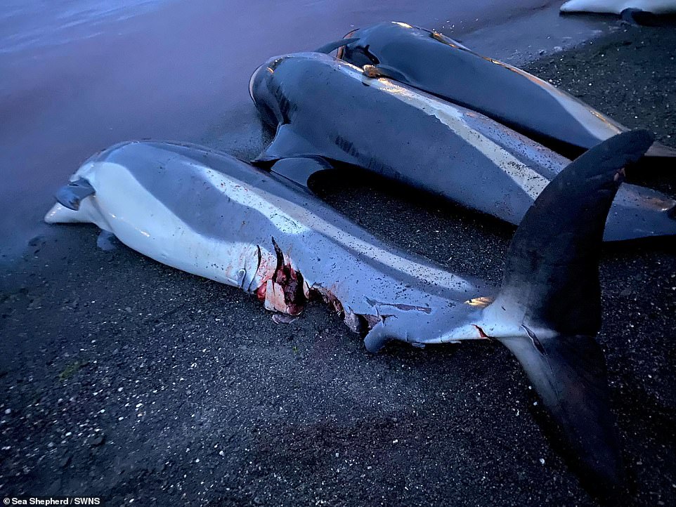 Les chasseurs sont montés d’un cran hier dans la cruauté, certains dauphins ayant été découpés par les pales des hélices de bateaux, d’autres ont été découpés vivants alors qu’ils agonisaient sur la plage.